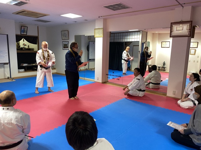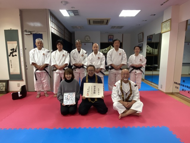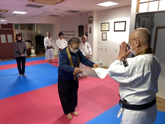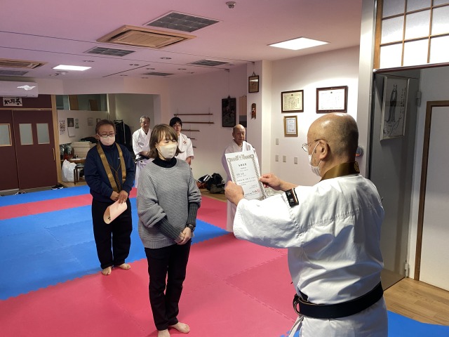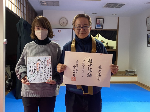 本町道院の門下生 荒関ご夫妻に僧階認証と級拳士合格証の授与を行いました。
